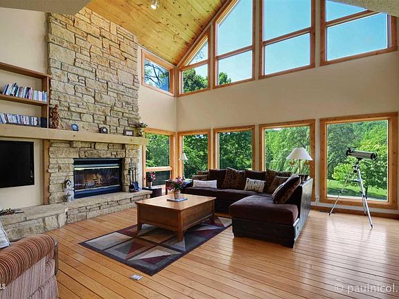 Welcome home! Whether as a vacation get-away or a permanent residence, this contemporary masterpiece, located in a prime location, greets you with a grand front entrance which includes an expansive porch framed by limestone pillars. The WOW factor starts immediately upon entering, with the spectacular view through the back of the house from the foyer. The great room is centered on a two-story stone fireplace with a wall of windows to the roofline, providing plenty of natural light and a view overlooking the 14th tee and fairway of the Eagle Ridge South Golf Course. Entertaining family and friends is a breeze as the great room flows to the kitchen, dining room, deck and porch. The kitchen, centered on an oversized island, allows plenty of space for gathering, meal prepping and dining together. The balcony level features two spacious master suites with views across the valley, while the lower level has a walk out family room, bedroom and full bath. The fourth bedroom and bath are on the main level. The house is surrounded by a professionally landscaped yard and includes a paved island driveway. This versatile home offers a vast array of entertainment opportunities ranging from family game nights and outdoor barbeques with a house full of guests to a simple and serene weekend getaway for two. Recent improvements include a complete exterior staining (2016), replacement of the outdoor deck with long-lasting Trex (2016), reshingling of the roof (2014) while on the inside replacement of the refrigerator (2014), washer and dryer (2014).