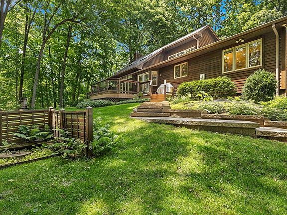 Stunning & oh so private w/3+ lush acres in Chesapeake on the Bluff. 4 Bed, 3 bath walk out w/stunning curb appeal. Supplemental feature sheet in MLS. Your eyes will be pulled to the 2 story atrium w/ceiling to floor windows. Open loft overlook & cozy wood fireplace to watch falling snow & wildlife at play. Custom kitchen w/soft close cherry cabinets, quartz w/lighting, breakfast & walk in pantry. "Shade room” sits to the side, for those lazy summer days. Multi- access to composite deck. Gorgeous living room w/gas/marble fire + built ins. Main floor master w/built in cherry wardrobe & ensuite w/walk in shower. 2nd bed on main is premium office space. 2nd bath w/easy access to outdoors. Beds #3 & #4 upper level luxury w/vaulted ceilings & perfect views. Lower level drop zone, storage, tuck under garage, laundry & spacious family room. Pest resistant Redwood exterior + low maintenance perennial plantings. 2 acres of invisible dog fence for a true puppy paradise!