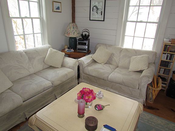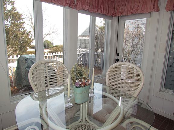 Spectacular water view two-bedroom, one bathroom condominium with private association beach access in the exclusive resort community of Maushop Village in New Seabury. Close to Popponessett Marketplace and Inn, shopping, dining, world-class golfing and community nature trails. Features exposed wooden beams, wide pine flooring and lots of natural light throughout. Newly updated kitchen with quartz countertops, island eatery, stainless Samsung appliances, pantry storage and stackable washer/dryer. Sunroom doubles as formal dining with walls of windows and views to Nantucket Sound, vaulted ceilings, and direct access to rear private patio, outdoor dining and BBQ grill. Waterview second story principal bedroom with vaulted ceilings and full size closet. Additional first floor guest bedroom with skylight and full-size closet. Second story full bathroom with shower/tub, skylight and linen closet. An assigned parking space directly abuts the private front patio, visitor parking nearby.