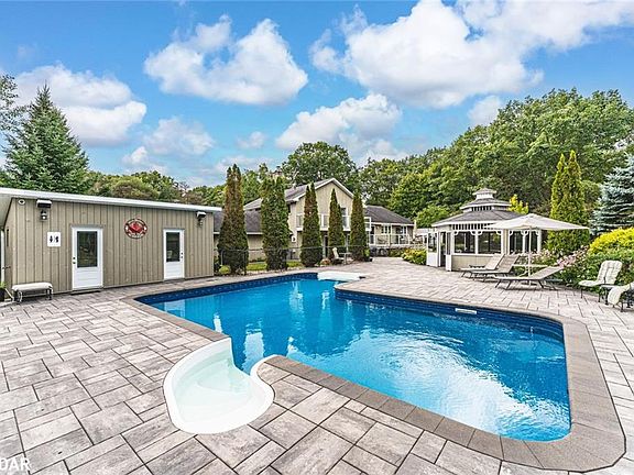 RESORT-INSPIRED ESTATE LIVING ON 2.2 ACRES WITH A BACKYARD BEYOND COMPARE PLUS SHARED OWNERSHIP OF A 13.37-ACRE PARCEL BEHIND! Unveiling 2 Mills Circle, a resort-inspired estate on 2.2 acres with a backyard designed to astonish. Estate-style living meets resort luxury with gardens that frame an inground saltwater pool with a newer liner, surrounded by extensive stonework, complemented by a poolside building with a 3-piece bathroom, a pergola, and a gazebo with a sitting area. Multiple decks create spaces for lavish entertaining or private escapes, all set within an atmosphere of refined seclusion. Adding to the exclusivity, this property also includes shared ownership of a 13.37-acre parcel of land located behind the residence. The home presents hardwood floors, pot lights, crown moulding, wainscotting, and freshly painted walls. An elegant kitchen showcases white cabinetry, granite counters, a centre island with a second sink, tile backsplash, and a walkout to the expansive deck overlooking the grounds. The primary suite impresses with a walk-in closet, 3-piece ensuite, and a private balcony, while the lower level features a family room with a walkout and a gas fireplace, a mudroom, a fourth bedroom, and a powder room. A finished basement with a sprawling rec room anchored by a second fireplace delivers an impressive setting for everything from quiet evenings to lively occasions. Completed by a triple-car garage with inside entry, renovated bathrooms, and a water softener with an iron filter, this residence is both elegant and practical. Enjoy proximity to the Barrie Sports Complex, Snow Valley Ski Resort, golf courses, scenic trails, and Bayfield Street’s shopping and dining.