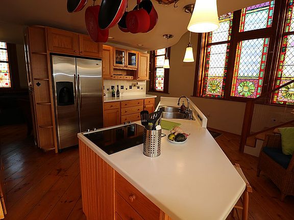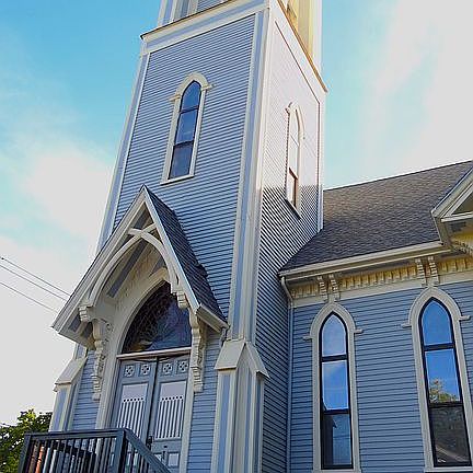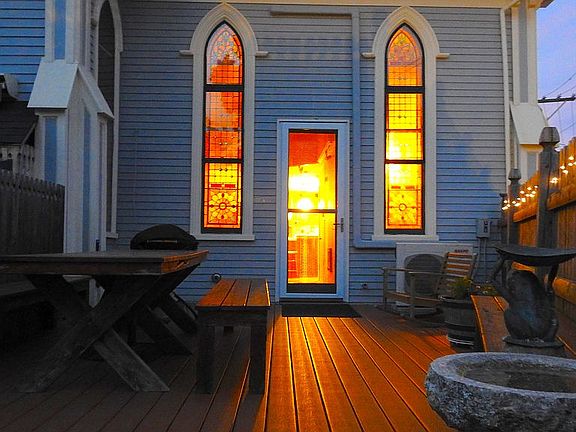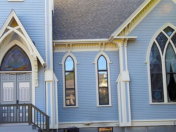 Converted from Camden's original 1890 Methodist Church, the Steeples has three floors of living space. Then there is the spiral staircase that leads to the actual steeple, which offers a singular overview of Camden Village and its quintessential Maine harbor. Each night, the steeple lights the head of the village main street with Mt. Battie behind it. Inside, each level offers its own peculiarities, from hand-crafted oak paneling, hidden nooks, and antique stained-glass windows. Bright, eclectic, and designed for purposeful puttering, this elegant dwelling provides for living a life well beyond ordinary.