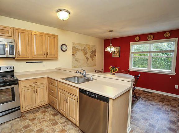 This rare gem has it all! 3 bedrooms, 2.5 Bath Private and Spacious End Unit with Garage, plus room to garden and entertain! Updated Eat-in Kitchen, Living Room with Fireplace and sliders to private deck. Upstairs you'll find the Master Bedroom, New Master Bath (2015), 2 additional bedrooms. lots of closets and full bath. Partially finished Full Basement offers tons of storage and a play room. Brand New Windows and Sliders (2015). Average electric is $215 per month. All new kitchen appliances (2015)..microwave hasn't ever been used! So much to do in this great community with the beautiful pool, kids pool, and playground. Can do a quick close in time for school! Garage is 2nd from the right