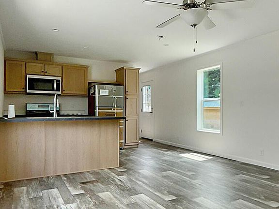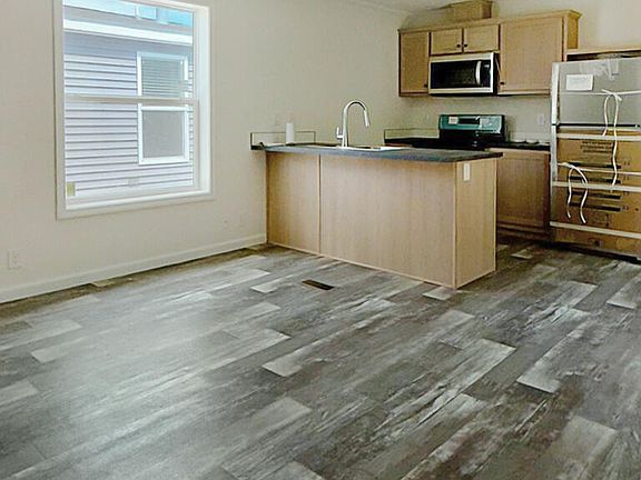 New 3-bedroom, 2-bath single-wide home. This 16x66 home offers 1,001 sq. ft. of bright, comfortable living space with an open floor plan that connects the kitchen and living room. The kitchen includes an island with seating, wood cabinetry, and new appliances, while the living room is filled with natural light and fresh finishes. The primary suite has its own full bath and closet, and two additional bedrooms give you space for guests, an office, or hobbies. Durable rustic-style flooring runs throughout the home, and both bathrooms feature clean, modern fixtures.