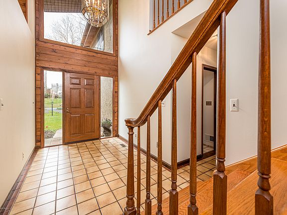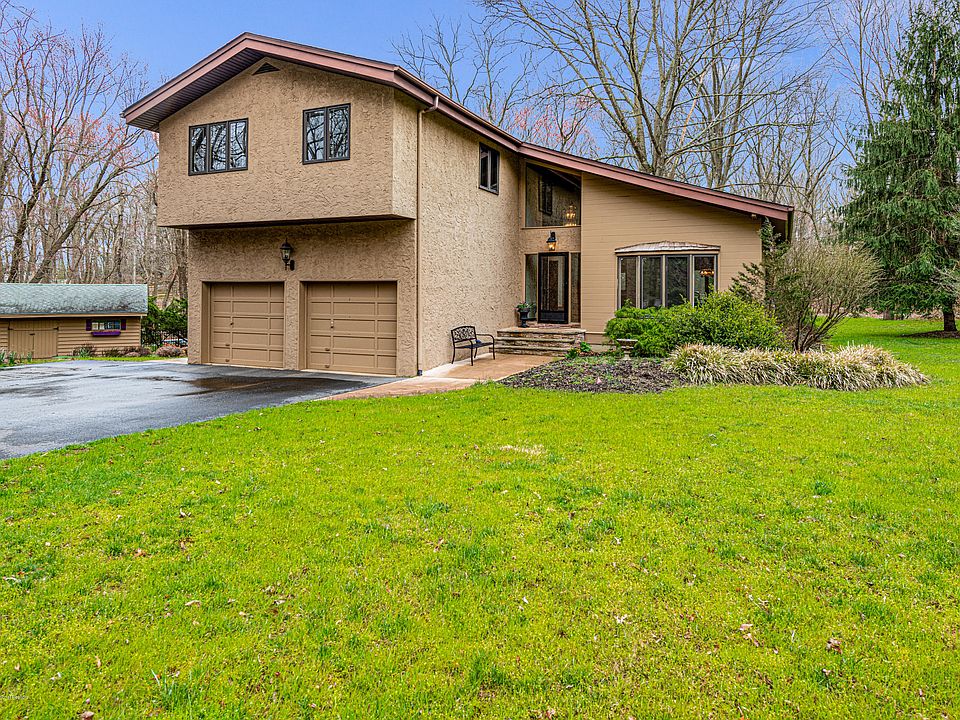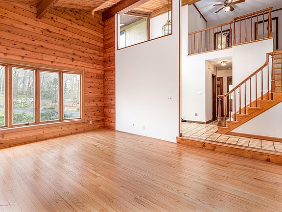 Not your ordinary LOG home. This custom log and stucco home sits on 1 plus acres of lush wooded property. Enter through the 2 story foyer leading into the sunken living room with a cathedral, beamed ceiling. Feel the warmth of the log walls that carry through into the dining and sun rooms. The large kitchen with lots of cabinetry has a separate dining area. Family room with a wood burning fire place and office both with exterior log walls complete the first floor. This home has 4 bedrooms, 3.5 baths, open loft space and a finished basement with a wall of storage and access to the yard and pool. Enjoy the outdoors from the expansive deck overlooking the in ground pool. Store all the yard and pool equipment in 1 of the 2 sheds. A home you must visit to really appreciate.