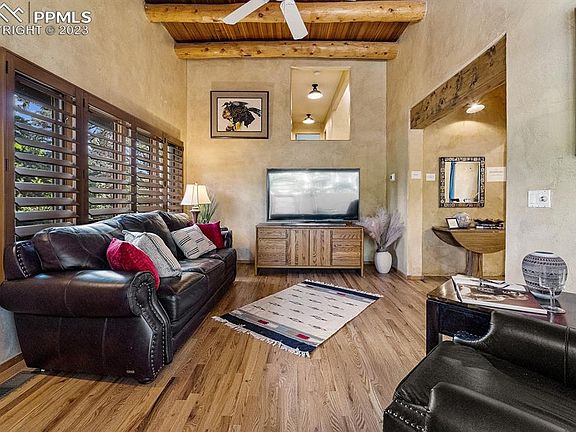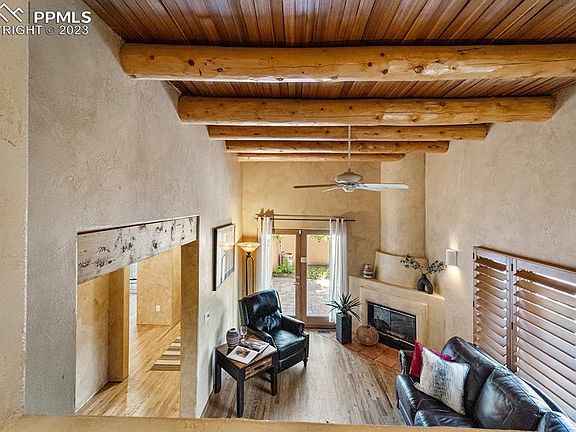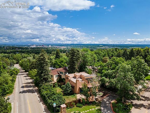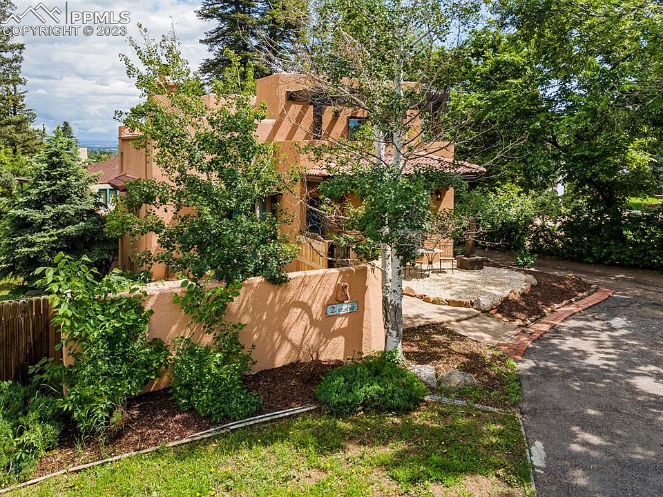 Amazing location! Just 3 minutes to the historic Broadmoor Hotel and an 8-minute drive to downtown. Enjoy low-maintenance living in this unique custom home. Built in 1995, old Santa Fe charm radiates throughout. The living room boasts 12’ Latilla /Viga ceilings, with hardwood floors, cozy gas fireplace and french doors that lead out to a private patio and gas firepit. The kitchen has been completely remodeled with new cabinets and granite countertops. There are two primary suites on separate levels. The upper suite also features a private balcony and a recently remodeled bathroom. The home was recently renovated, adding 300 square feet to create a larger dining area, bedroom suite and private patio on the 3rd level. In the garden-level basement, there are two additional bedrooms/office along with a full bath. This is a true designer/ Artist's home with unique fixtures throughout. Located on a tree-lined street with a circular drive and perennial landscaping just a mile from the Broadmoor Hotel