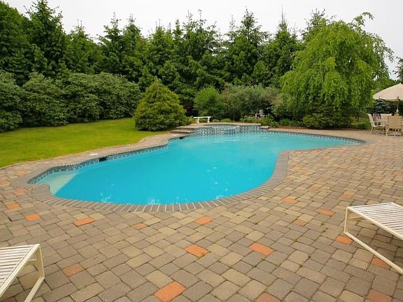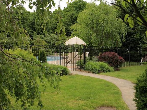 This French country manor built in December 1994 is set on two acres of beautiful private landscaped property on the desirable East side of Mendham, Twp. The property is on a private road with a 600 foot beautifully tree lined driveway. There is a circular driveway adorned with pavers. The in ground pool was built in 1999 and is in the rear of the property off to the right. The pool has beautiful new tile, totally renovated in October 2013. The double front door entranceway has a 22 foot ceiling with curved staircase. There are two closets in the foyer. The main floor has a large dining room has two circular top windows that look out on the front property. The butler’s pantry is adjacent to the dining room and has a wet bar. Circular top windows add a lovely touch to the living room and the charming sunroom as well. The sunroom has an 11 foot tray ceiling. The impressive 22 foot ceiling family room has floor to ceiling windows with gas fireplace. The family room has brand new hardwood flooring with a French knot mahogany inlaid. The remaining downstairs rooms have 9 foot ceilings. Your guests will be comfortable in the first floor bedroom (or office) with an adjoining full bath that was been recently renovated December 2013. The Large Kitchen recently renovated this past fall of 2013 is open to the family room, great for informal entertaining. The kitchen double doors step out on the deck area with gas connection for gas grill. The laundry room is off the mud room. The downstairs all refreshed with new paint. The mud room opens to the 3 car garage. The large master suite has 11 foot tray ceiling with a sitting area, full bath Jacuzzi style tub. The master bathroom recently renovated and with new Anderson windows December 2013. There is a very large walk in MBR closet. The access to the full attic is in the MBR closet. There is also a little room off the MBR closest that could be made into an additional private office or workout room. There are three additional bedrooms and a full bath on the second floor that was completely renovated in August of 2013. These second floor rooms have 9 foot ceilings. The second floor overlooks the downstairs. The full basement has many windows and 9 foot ceilings which could be finished for additional living space. The property has water sprinkler system and invisible fencing for pets. The property has open space to build a tennis court should you wish to have a tennis court in addition to the play areas and stone patios on the grounds.