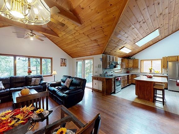 - Liv Dscrp: Exterior Access, Window(s) - Bay/Bow/Box, Main Level, Ceiling - Cathedral, Deck - Exterior, Open Floor Plan, Flooring - Wood, Balcony / Deck, Ceiling Fan(s), Ceiling - Beamed, Wood / Coal / Pellet Stove, Lighting - Overhead, Ceiling - Vaulted