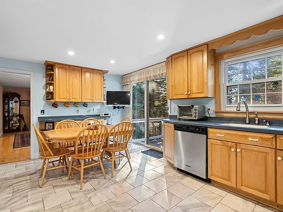 This 5-bedroom, 3-bathroom, 3 car garage home on a corner lot & cul-de-sac offers an exceptional blend of style and functionality, ideal for entertaining. Step inside to discover an inviting interior with a versatile layout that includes a dedicated office space-perfect for remote work. The kitchen features maple cabinetry, and dining area, w/built in cabinetry, ideal for casual dining, plus sliders for rear deck access. The adjacent dining and living areas w/maple floors flow seamlessly, making it easy to entertain. Treat yourself to a spacious 1st floor, primary bedroom w/vaulted ceilings, fan, skylights, large closet, bath with steam shower and access to private back deck. 4 additional bedrooms offer plenty of room for guests, or a home gym. Finished lower level includes a TV room and gaming area w/wet bar. The paved backyard oasis includes; 2 decks, an above ground pool, hot tub, outdoor shower, pizza oven, storage shed and fenced dog run. Solar panels help manage utility costs.