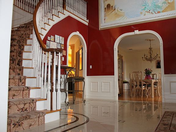 Custom Brick Colonial on a spectacular wooded lot with two ponds,water falls and walk up bridge. Grand Center Hall with marble ceramic tile and walnut marble inlaid border. Two-way paver driveway. Five-Star energy rating. In-floor 7 zone heating system on the entire first floor, basement and master bath. Second floor bedrooms have baseboard hot water heat. Insulated pella windows. Entire home has 2" by 6" beams and wired with cat five fiber optic wiring.