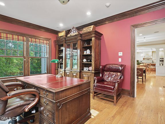 Extraordinary 2007 custom home in Hillcrest Park's Old Farm Lane Association conveys refined elegance throughout with hardwood floors, soaring ceilings and exquisite millwork. Formal living and dining rooms and a gourmet kitchen invite lavish entertaining. Family rooms up and down, plus a walk-out lower level, welcome casual gatherings. Luxurious owner's suite with spa bath and massive walk-in closet. Secondary beds all include attached baths, with room for staff quarters. The park-like grounds include a flagstone patio and room for a pool. Abundant storage and upgrades throughout. Mudroom, laundry room, study, office, game room with bar, home theater and gym. Three-car attached garage with E/V charger. Premier Old Greenwich location close to shopping, country clubs and top-rated schools.