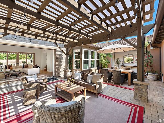 Nestled on a large and exceptionally private corner homesite at guard-gated Covenant Hills in Ladera Ranch, this move-in-ready residence offers the rare advantages of a single-level floorplan. A virtual forest of mature trees and lush, beautifully maintained landscaping sequesters the home from its cul-de-sac neighbors and lends shade and serenity to multiple outdoor patios, seating areas and gardens. These gorgeous spaces flow easily to the interior through multiple sets of slideaway glass doors, creating a highly desirable indoor/outdoor living environment that embellishes entertaining and daily living. The one-story design is impressively sized at approximately 3,252 square feet and features four bedrooms and three- and one-half baths. Two primary suites are showcased and separate from secondary bedrooms for maximum privacy. Soothing natural light fills the home with a bright and warm ambiance, while custom French Oak hardwood flooring, distinctive archways, vaulted and beamed ceilings, fresh interior paint, and custom crown and base molding are on display. Opening to a fireplace-warmed family room with access to two patios, the kitchen hosts an oversized island with seating, handsome cabinetry, granite countertops, a walk-in pantry, built-in breakfast nook, full tile backsplash, and a top-of-the-line Thermador appliance package including a built-in refrigerator and a six-burner range. The main primary suite is introduced by an entry with built-in cabinetry and shelving and offers a sitting area, a spacious walk-in closet with custom built-ins, and a lavish bath with jetted soaking tub, separate shower, dual vanities and marble finishes. Spanning about 16,380 square feet, grounds reveal extensive custom hardscaping, with pavers finishing a long driveway, patios and walkways. Custom arbor-style patio covers and elegant fountains enhance select areas, the courtyard offers a spacious and private outdoor oasis, and a custom open-air fireplace lends a touch of enchantment to evenings with friends. One patio features a custom built-in BBQ island with Fire Magic grill and appliances, and an another presents terraced gardens complete with fruit trees. Covenant Hills is the most exclusive neighborhood within Ladera Ranch and offers a luxurious private clubhouse, swimming pools, spas, tennis, parks and trails. Residents will appreciate being close to award-winning schools, shops, restaurants, and the coastal towns of Dana Point and Laguna Beach.