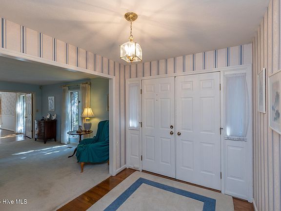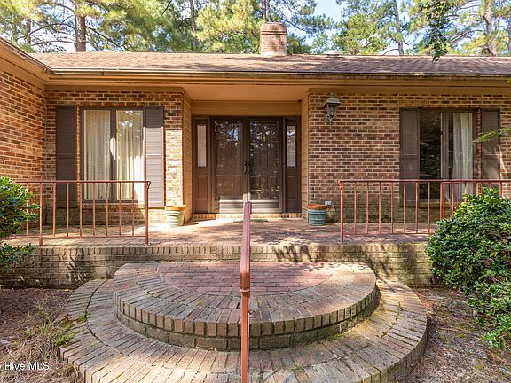 Situated on a beautiful, wooded corner lot in one of Pinehurst's most established neighborhoods, this spacious brick home offers privacy, character, and convenience. Mature landscaping surrounds the property, creating a serene setting just minutes from the historic Village downtown, shopping and dining. Step inside to a warm and inviting interior featuring a large living room with a classic brick fireplace, raised hearth, and bookcases. Sliding glass doors open to an enclosed porch that spans the back of the home, ideal for enjoying your morning coffee or hosting guests. A generous dining room, accented with hardwood floors and chair rail trim, flows into a cozy breakfast nook with built-in desk and cabinetry. The kitchen features an abundance of rich wood cabinetry, granite countertops, and easy access to the porch and powder room. The spacious primary suite offers two large closets, an en-suite bath with a tiled jetted garden tub, walk-in tiled shower, and walk-in closet. A second main-level guest suite includes a full bath (also accessible from the hallway). There is also an office with gorgeous built-in cabinetry and bookcases and sliding glass doors to the back porch completes the main level. Downstairs, the fully finished lower level features a large family room with a second brick fireplace, ample closet space, a full bath, and laundry area, perfect as an in-law suite, guest space, or rec room. Sliding doors lead to a covered porch and deck, perfect for outdoor entertaining. A walk-in crawl space provides even more storage options. This beautifully maintained home combines timeless features with modern comforts, all in a prime Pinehurst location. Don't miss the opportunity to make this private retreat your own. **the lot behind this one is owned by Pinehurst, so privacy should not be an issue**