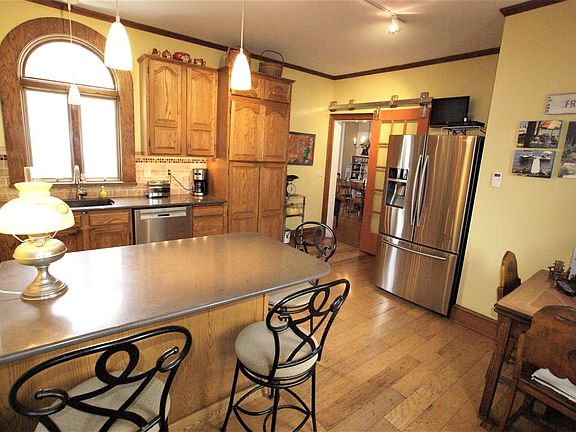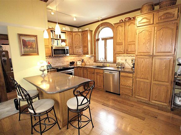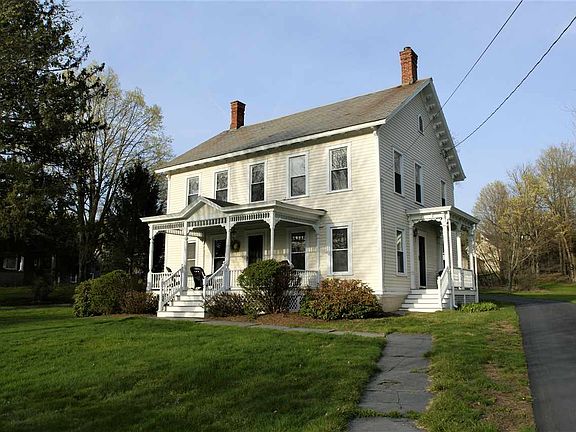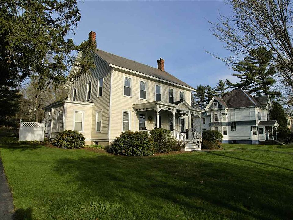 Village Park View featuring beautifully restored and updated Center Hall Colonial with absolutely stuning custom kitchen w/sitting area & breakfast counter fully aplianced, formal dining, double living room w/brick hearth & wood stove, spacious master bed room w/nice walk in closet & master bath w/whirpool tub & shower, extra large laundry-pantry room down & open stairway leading to four more spacious bed rooms and second full bath up along w/three bonus rooms for storage or additional guest quarters. Gorgeous wood flooring and original trim work throughout home, covered front porch, all mechanicals updated, circular paved drive, nice patio garden sitting space, detached two bay barn-garage w/huge storage attic above, mature landscaping, walk to all location & mins to Vermont!
