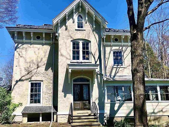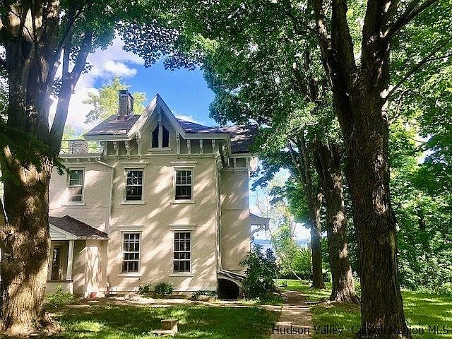 A rare offering: situated at the end of a pretty historic street on one acre and spectacular views of the Rondout Creek. This three story circa 1800 beauty in the Italianate style is a brilliant example of old world Kingston architecture. The 3673 square foot three story home has 12 ft ceilings on the main level, plaster work and pressed tin ceilings on the first and second floors, and the third floor is a separate one bedroom apt that has a feeling of being in a castle tower. There is a sq ft 1485 basement for storage with one room that is particularly finish able should a buyer need more room for creative endeavors. The house is surrounded by tall trees and pretty plantings and the yard has enough space and sun for a garden or small fruit orchard. There are commanding south facing five mile views of the Hudson and the Rondout boating activity. The house is graced with an abundance of natural light; all varied and interesting in the changing seasons and at different times of the day. Walking distance to Kingston Point Park with boat launch, beach and lots of walking trails along the River and close enough to stroll to the waterfront restaurants for dinner.
