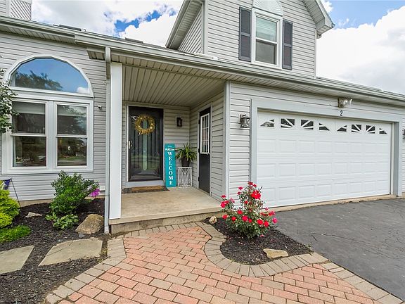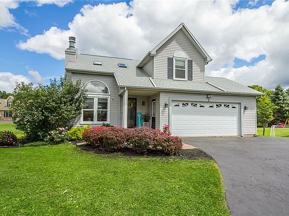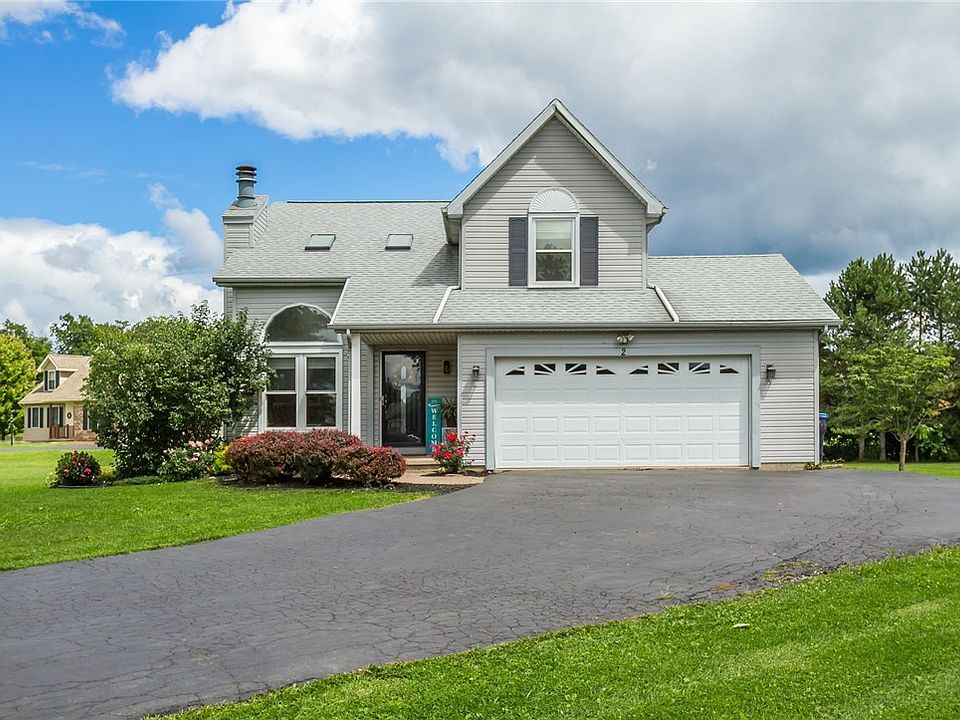 OPEN HOUSE WEDNESDAY 8/28/24 from 5:00-6:00!! Welcome to 2 Pound Ridge Circle! This picture-perfect home is located in a highly sought-after neighborhood in the Churchville-Chili school district. This bright and welcoming Colonial home offers a spacious and open floor plan. The large living room features a beautiful gas fireplace with brick surround and a cathedral ceiling with skylights. The living room opens into the formal dining room with a door to the deck with all-new vinyl railings. The Kitchen has a breakfast bar, pantry, and new appliances all included! The first floor also has a powder room. Upstairs you will find 3 bedrooms with ample closet space and an updated full bathroom. The basement adds great additional space and storage. This beautiful home has great curb appeal, an oversized driveway, 2-car garage and is set on a large lot located in a cul-de-sac. Pride in ownership shows with numerous updates throughout, including new windows in 2022, tear off roof in 2017, skylights in 2017, and more! A truly a must-see home!