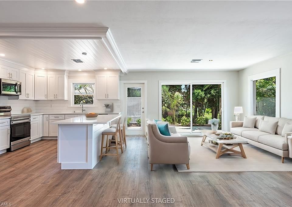 Welcome to an impeccably renovated three-bedroom, two-bathroom residence, a rare gem with exquisite upscale finishes in the sought after Rivard Villas neighborhood. Every detail has been meticulously curated to elevate your living experience. Step inside to discover a haven of sophistication, featuring a stunning wood ceiling detail in the kitchen that adds warmth and character to the space. This residence boasts a thoughtfully redesigned open floor plan, seamlessly blending style with functionality. The heart of the home, the brand-new upscale kitchen, showcases top-of-the-line appliances, new custom cabinetry, and quartz countertops. The kitchen flows seamlessly to the dining and living area, perfect for entertaining friends and family. Both bathrooms have been tastefully updated to exude contemporary luxury, providing a serene retreat for relaxation and rejuvenation. Additionally, the convenience of an attached one car garage and in-residence laundry adds a touch of practicality to your daily routine, ensuring that every aspect of modern living is effortlessly catered to. The roof, just 3 years old, stands as a testament to recent upgrades, promising durability and longevity for years to come. With meticulous attention to detail, both electrical and plumbing systems have been entirely revamped, ensuring efficiency and reliability throughout the property. Notably, the majority of windows boast impact glass, a feature that not only enhances security but also offers peace of mind against the elements. These modernizations not only elevate the functionality of the home but also speak to a commitment to quality craftsmanship and thoughtful investment in its infrastructure. Step in to your own private oasis—a quaint outdoor living space where you can unwind and bask in the beauty of nature. Experience the pinnacle of upscale living in this meticulously renovated residence, where luxury knows no bounds and every detail exudes unparalleled quality and craftsmanship. Rivard Villas is a quaint private community located less than 2 miles from downtown Naples fine dining and shopping, Naples Design District, and Gulf of Mexico. Nestled next to the upcoming high-end development of Metropolitan Naples and the coveted Royal Harbor boating community, Rivard Villas offers reasonable fees that cover lawn and land maintenance, water, as well as insurance. Indulge in the Naples’ lifestyle in this exceptional property.