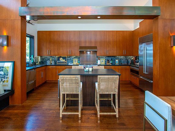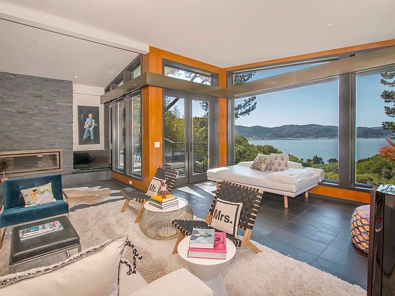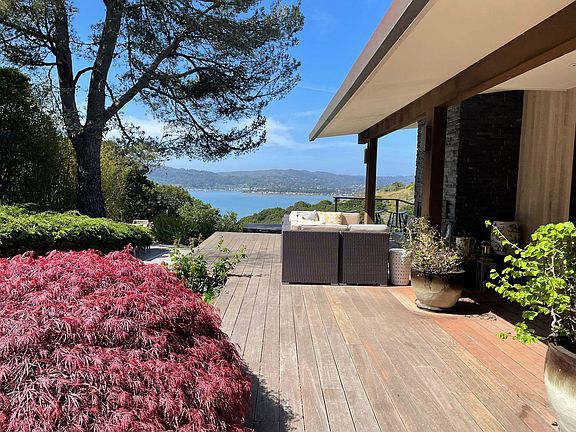 Bushell Homes Presents: Nestled into a romantic Japanese garden, this oasis comes with one of the most-coveted private water views in Tiburon, a pool disguised as a pond, infinity hot-tub and gas fireplace. Inside, the open floor plan features floor-to-ceiling glass windows and high ceilings with additional windows that allow light and the dramatic views to flood both the sunken living room that has a gas fireplace and the kitchen with its Wolf oven and six-burner stove, and four-top island. Large terraces on both sides of the living room bring additional light and air. The master suite, with vaulted ceiling and gas fireplace, opens onto one of the water-view terraces and features a his-and-her walk-in closet system, and a generous bathtub with a sweeping private view. Three more bedrooms, one an en-suite, and an additional full bath complete the main floor. Downstairs, a super-size office with its own full en-suite bathroom has a terrace and gorgeous water views, and an au-pair suite with full bath, kitchen and large media room, provides added living space. Surrounded by lush fruit trees, the driveway has space to park 6+ cars. A clean garage has space for two cars and storage. Selma Bushell Real Estate Broker DRE#0105129. For more homes go to Bushell Homes