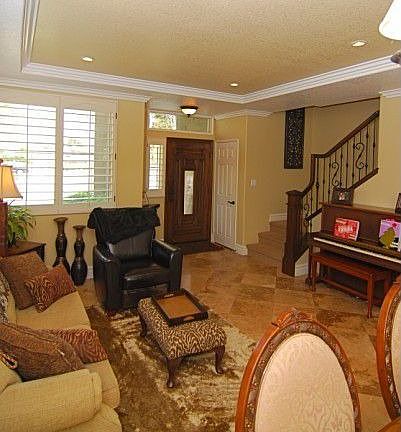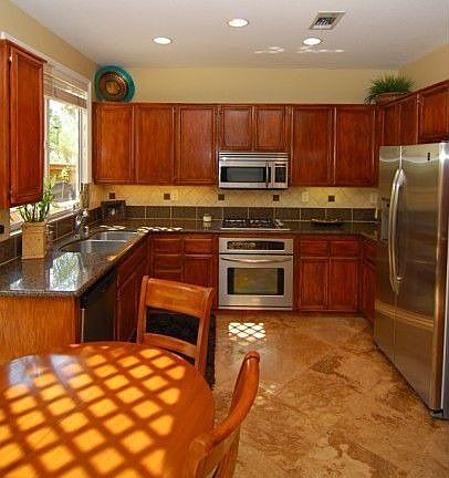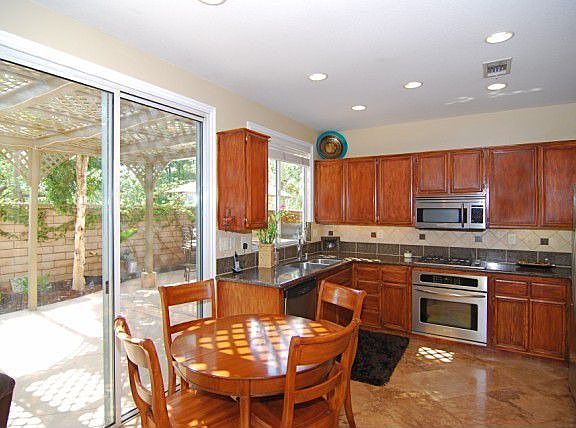 Beautiful upgraded Expressions home features 4 bedrooms, 3 baths, bonus/theatre room, an office off the master bedroom, 2 car garage at the end of a cul-de-sac. The kitchen has gorgeous granite countertops with stainless steel appliances that opens to the casual dining area and family room with a welcoming travertine fireplace. Formal living room entrance with formal dining room, trey ceiling and travertine floors throughout the downstairs. The master suite boasts an upgraded master bath room with stone floors, granite counters, decorative lighting, slate stone shower, and a soaking tub. The backyard is an entertainers dream with a built in BBQ and refrigerator in an entertaining island. Additional features include ceiling fans in bedrooms, recessed lighting, upgraded baseboards, and first floor laundry.
