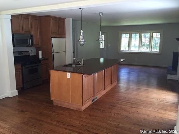 Long private road leads to a 2 bedroom and 2 bath house that is completely private abuttuting open space. Hardwood floors, central air, washer/dryer, fireplace, open floor plan, electric garage door openers for the 2 car garage, a screened porch and detached barn/studio. Surrounded by White Memorial Land Conservation. Tons of storage in the basement. Walk to the lake.