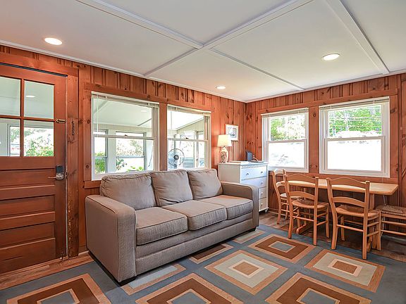 Beach Bungalow is a one-level rental designed for easy living. Take in the brilliant colors of the Fall foliage from the three-season enclosed sun porch. The living room doubles as the dining area with table and comfortable seating. Off of the living area are two bedrooms - one with a full bed and the other with bunk beds. Full bathroom with a walk-in shower. The compact but very functional kitchen has everything you need. A door from the kitchen leads to the back deck which is set up with outdoor seating with views of the water.