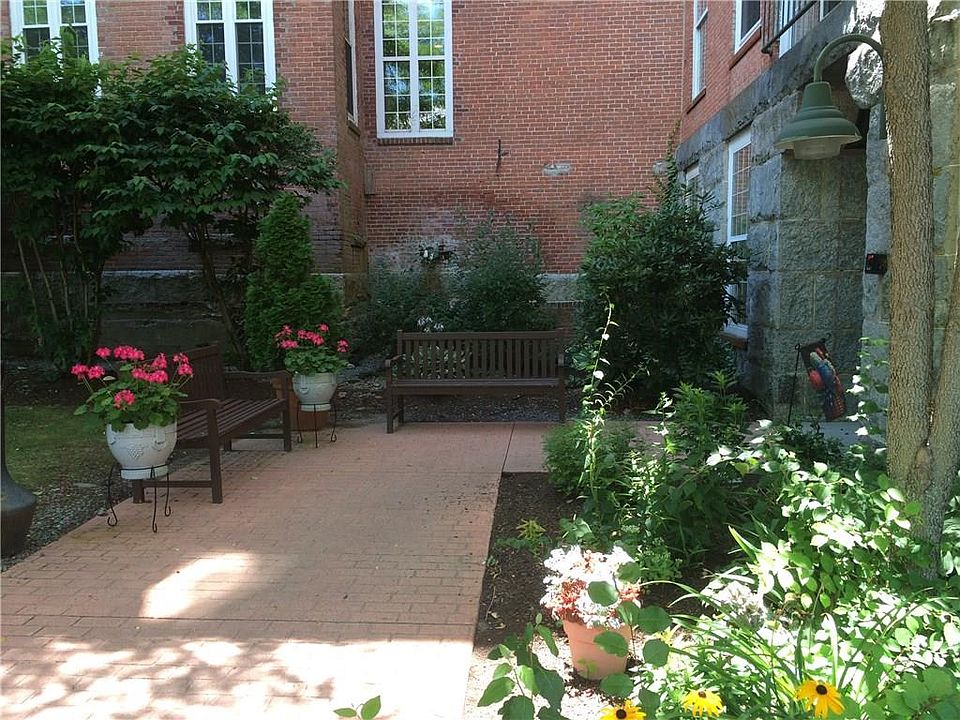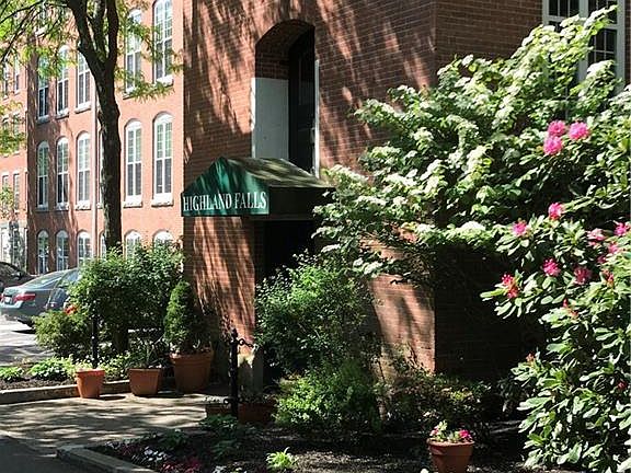 Pleasant, attractive and tastefully updated one level condo in popular complex along the Blackstone River. Step outside your door to enjoy walking, jogging and biking on the Blackstone Valley Bikepath. Wooded views with the sounds of nature are right outside your bedroom windows. This home has 11 foot beam ceilings and exposed brick. The 7 1/2 foot windows make it a bright and welcoming home. You will see shining hardwood and tiled floors in the living room and dining area. This beautiful condo has a modern, tiled fully applianced kitchen with granite, 2 bedrooms, 2 full baths, and central air. The MASTER BEDROOM with bath has a large walk-in closet. Laundry in the unit is a ventless washer/dryer. Great location with easy access to highways, shopping, dining, and more. Taxes shown do not include 35% homestead exemption which the owner can apply for after closing. Condo fee includes water, sewer, common area maintenance, flood insurance and snow removal. Dogs are not allowed at Highland Falls.
