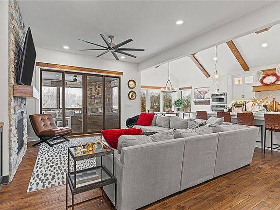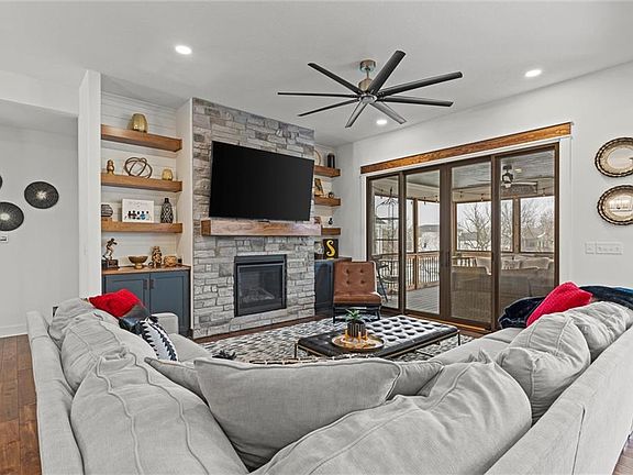 Downstairs is a spacious recreation room, a wet bar w/ accent wall/custom shelving & plenty of room to host for the next big game. Walk outside to the covered patio which is great for a barbecue or corn hole tournament. Walk down the natural stone path from the patio to the custom built fire pit. The home is on a large corner lot w/ a lake fed sprinkler system ensures that your lawn stays lush & green. Located in the desirable Lee's Summit School District. Lake Winnebago offers amenities such as lake access, walking trails, tennis courts, Community Boat Ramp, and Yacht Club Restaurant. Boat Slip transfers with property ($1800/yr agreement for slip or can have an assigned renter on yearly basis). New Pool planned for near future. Don't miss out on the opportunity to own this incredible home!