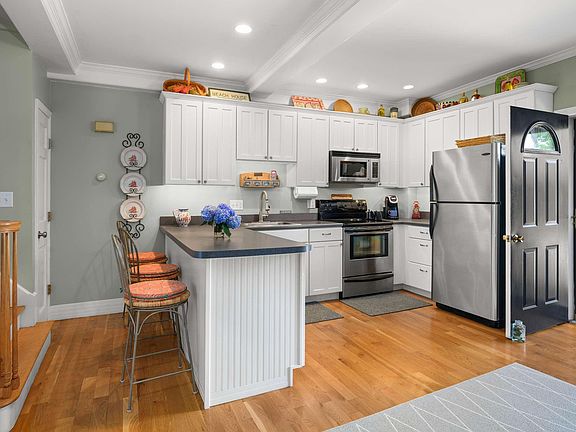 Located in the heart of York Harbor, walk within minutes to the beach, restaurants, shops and the scenic Fisherman's Walk and Wiggly Bridge from this charming 2 bedroom town home. It is an ideal weekend retreat or year-round residence. One of only 4 units situated in a grand Victorian home, this nicely renovated unit has many upgrades and appealing features. From the custom pergola and beautiful gardens on the front stoop, step into the elegantly decorated, open concept first floor boasting high ceilings, crown molding, coffered ceiling and gleaming hardwood floors. An updated kitchen with stainless appliances as well as the dining and living room spaces make up the main floor of the home. From the living area, step out on to the private rear deck and backyard patio perfect for entertaining and taking in the sights and sounds of the Harbor. The second floor of the home offers the primary bedroom, a guest room and spacious custom tiled bath with a stackable washer and dryer for added convenience. Additionally, the unit has all newer windows throughout, dedicated onsite parking for 2 vehicles, spacious basement storage for all your beach, bikes and other gear and low monthly condo fees. Immaculately cared for and updated by the current owner, this is a turnkey home on the lovely coast of Maine.