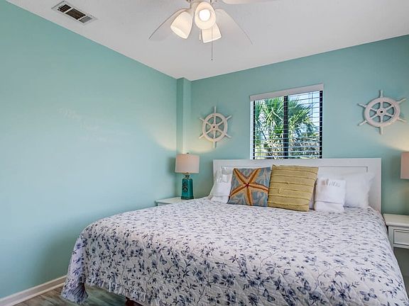Welcome to this 2-bedroom, 1-bathroom open-concept condo, the ultimate beach getaway! Feel at home with easy access to the beach via the boardwalk just across the street and enjoy the convenience of off-street parking. Perfect for families and friends, this condo accommodates up to eight guests and is within walking distance of restaurants and shops. Pets are welcome for a fee. This upstairs unit invites you to climb the exterior wooden stairs and enter through the front door labeled with a "C" using a digital keypad. The hallway leads to all areas of the condo, including a master bedroom with a king-size bed and an ensuite bathroom with a shower/tub combination, and a second bedroom with two full beds. The open-concept fully equipped kitchen, dining space, and living room at the end of the hall offer a sofa bed, two chairs, and a SmartTV. Additional seating is available at the dining table with four chairs, and access to the patio is through the living room. Pets are welcome with a non-refundable pet fee. Pets must be crated when left unattended in the home and are not allowed on furniture or beds. All waste must be cleaned up from the yard. If there is evidence of pet hair on the furniture, excess hair in the home, stains, or waste found in the yard or home, you will be charged the cost to clean this. Located within walking distance of the beach and many restaurants, this home is just a few doors down from The Sugar Shack. Uber, Lyft, and other taxi services are available, but driving is encouraged for ease of getting around. The condo is part of a home with three units, offering full and private access to your unit. Shared areas include parking and the yard. A signed rental agreement is required and guests must be 21 years of age to book. A digital keypad at the front door provides access to the house, with the code provided upon check-in. Enjoy contact-free check-in and maximum privacy, with support just a phone call away if needed during your stay.