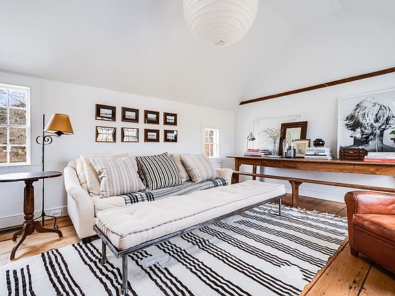 There's a reason that piece of wood flooring in the entry of a door is called a "threshold". As you enter Sherrill Farmhouse, and cross over that threshold, you are entering a cozy and stylish retreat. As you hang your straw hat on one of the 5 cast iron coat hooks in the front hallway, you are leaving the rush of the outside world behind. This masterfully restored circa 1858 Greek Revival Farmhouse has deep roots in the history of East Hampton. It on the National Register Of Historic Places and is a home filled with original detail and updated for modern living. The 1st floor hallway leads gracefully to a formal dining room with original built in cabinetry and working fireplace. A large round country table can seat up to 10 people with vintage 1940's French Bridge chairs that carry the warm patina of meals well served. The Living Room is styled with a George Sherlock sofa and arm chairs and vintage French and English fabrics are used throughout the home. A working fireplace centers the room where light drizzles in perfectly throughout the day. The den/media room has original circa 1804 wide plank pine floors, a large smart TV with Sonos sound bar. Unobstructed garden views are seen from the open Kitchen's bay windows where a French Farm table from the 1800's is placed, surrounded by 10 Tolix French Industrial chairs. A functional marble topped center island anchors the room. Double door stainless fridge, Wolf Stove, Miele dishwasher and a pantry are some of the kitchen perks. The 2nd floor has circa 1750 pine floors and 3 ensuite bedrooms. The primary bedroom has a King bed. The Farm Guest Room (with farm views) has a circa 1800's Queen sized Spindle Bed. And the "West Room" has a Queen bed and the ensuite bathroom also has a tub. There is a bonus room on the 3rd floor with a cheery area available to be used an office as well as another sunny room off of it. Exterior features include a heated pool with 4 teak cushioned lounge chairs and a fabulous Pool Hut featured in the Style section of The New York Times. It serves as a relaxation nook and is an original 1800's farm shed restored and now offers poolside shade and privacy. There is a large 30' X 20' barn on the property with gym equipment. It has an Olympic Barr Bench with weight and dumbbells. Plenty of room to bring your own gym equipment into. Has power. There is BBQ. And there is peace and warmth and style. [[Rental Registration # Pending]]