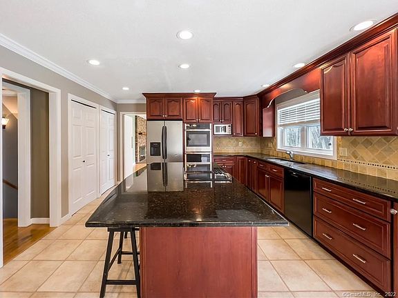 Perfectly situated in a Cul-de-Sac neighborhood in the heart of Brookfield, this custom Contemporary/Colonial is perfect for the discerning buyer. Main level floor plan includes large EIK, Dining Room, Spacious sunken LR w/vaulted ceilings & double sided fireplace which can be enjoyed from family room as well. Full bath and laundry room complete the first floor. Both the kitchen and family room have sliders to the expansive new trex deck overlooking a level and private rear yard which flows beautifully into the inground heated pool. 2nd floor includes primary bedroom suite with vaulted ceilings and a sitting room with fireplace and 3 additional generously sized bedrooms. The LL recreation room offers plenty of additional space, wet bar, walk-out access to the pool and an additional full bath. Prime location provides easy access to I-84, shopping and all area amenities! Do not miss your opportunity to own the beautiful home!