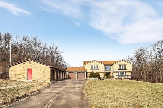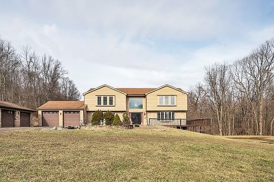Welcome to 2 Stinger Lane, a tranquil country setting with a private lane leading to a solid brick two story home situated on 16 acres with a pond. Enter into a graceful home with a winding staircase and spacious rooms with gleaming hardwood floors. There are French doors opening to the wrap around deck to view the rolling, wooded acres. Cozy up in the family room with a log burning fireplace and there is plenty of room to work from the first floor den/study. All five bedrooms and three full baths complete the second floor. Neutral throughout this lovely home is ready for you to personalize. The lower level includes a game room and offers access to the backyard. 2 HVAC systems. Yes!!! there are 7 main level garages, two attached to the house and 5 more perpendicular to the main entry. The pole barn is 30x45. Conveniently located to major highways. 2 Stinger Lane is a wonderful place to call home and to let your imagination wander to all of the possibilities.