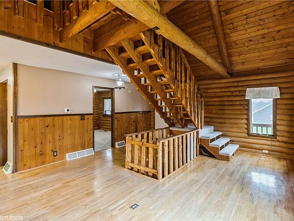 Be sure to check out this walk-out log ranch on 2+ acres in the city limits of Adel. Featuring 1666 sq. ft. of living space with 4 bedrooms, 2 bathrooms, it is an open floor plan with a loft (366 sq. ft.) above. First floor primary bedroom and laundry make this home very accessible. There is a wood burning stove to help cut down on the rising energy costs. The basement has 400 sq. ft. of finish and lots of storage. Outside, you'll find a secluded wooded, sloping lot with one very large wood deck, concrete patio area and outbuilding. Updates include, furnace (2023), central air (2021), garage doors (2022), newer gutters, roof and radon mitigation system. Although the property needs some updating, it has been well maintained. All information obtained from the seller and public records.