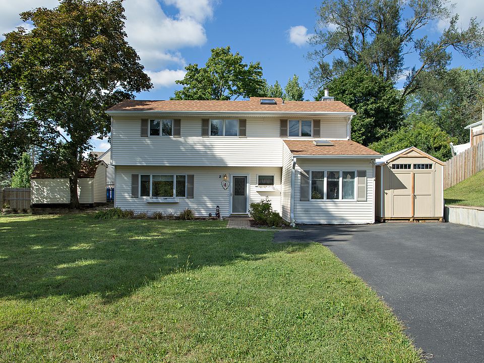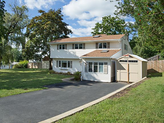 Bright and spacious defines this four bedroom, two bath home on a corner lot in move-in condition! Perfect for entertaining the large eat-in kitchen opens to a newly painted deck that surrounds the length of the house. Living room with skylight and wood burning fireplace adds to the warmth this home conveys. Hardwood floors on second and third level (under carpet on third level) natural gas heat and central a/c are part of the advantages in this home. Updates include new roof, furnace, driveway, appliances and more! Convenient to highway and railroad, this home is optimum for the commuter. Taxes reduced by $1072 with STAR!