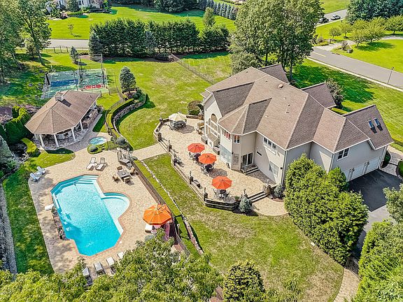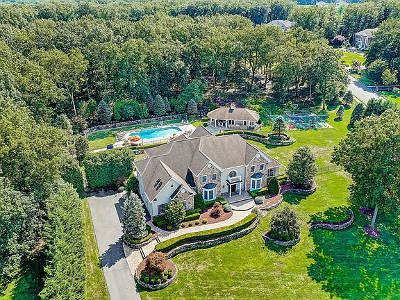 Sophisticated, elegant, entertainers' delight best describes this 5 bedroom, 5.3 bath estate in Marlboro. Sunlight fills the grand 2-story foyer with double turned staircase. Once you enter this magnificent home, you will be impressed with all that it has to offer from the architectural design to the backyard oasis. Home features a gourmet eat-in kitchen with center island, wood cabinetry w/ under lighting, high-end designer stainless steel appliances overlooking the spectacular grounds. There's a large 1st-floor in-law suite, wet bar, office, laundry, mudroom & conservatory with Palladian windows. The classic dining room is warm & inviting with a butler pantry. The grand 2-story great room gets exceptional sunlight and features a gas fireplace. The second floor has a Juliet balcony, two spacious bedrooms with a Jack and Jill bathroom, an additional bedroom with en-suite. Master Bedroom is your own private get-away; lavish en-suite with a Jacuzzi tub, steam shower, his and hers vanities, sitting room and a bonus/massage-mediation room. Basement has a media room with an electric fireplace, playroom, full bar with a game room and a separate gym. Gorgeous, private, resort-like backyard with a paver patio, glistening saltwater, heated pool with a waterfall, outdoor shower/changing room. Full outdoor kitchen with grill, burners and refrigerator, separate full bar with a pass-through to the pool house with heat featuring an additional kitchen, laundry and bathroom. Your very own private sport court with lighting! The smart home has GreyFox intercom system and Russound Music throughout the house, basement and pool house, security system with property cameras, extensive mouldings, tray ceilings, recessed lighting, ample storage and many more upgrades all done with exceptional detail. The 3 car garage with Gladiator storage system completes this home. Look no further; you have found your Dream Estate. Enjoy all that living in Monmouth County offers; close to NYC transportation, beautiful beaches, golf courses, horse farms, shopping and nightlife!!