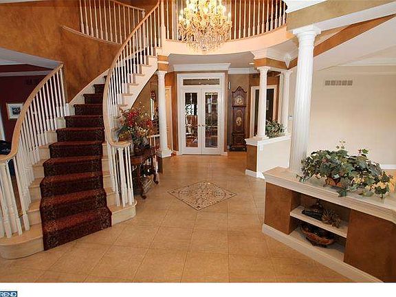 Stunning 2 story colonial with a contemporary flair on a vast 1+ acre lot with long distance views of the Bucks County countryside in desirable Timber Knoll; enter the home via a meandering walkway to a covered entry into a grand center hall entry foyer highlighted by an elegant circular staircase; formal living room and dining rooms flank the entry foyer and a solarium is located off of the living room, which, at one time was an indoor greenhouse with floor drain and hose bibs which could be converted back if desired; adjacent to the living room is a formal office with impressive built-in bookshelves and a box window that provides plenty of natural light; the step down family room is accessed through glass French doors from the entry foyer or directly from the breakfast room; it also features a stone, floor-to-ceiling wood burning fireplace with an exquisite custom mantel and an access door to the rear deck (deck is currently in need of repairs) overlooking a gorgeous rear yard; step up into the breakfast room and well appointed kitchen featuring gas cooking, Sub Zero refrigerator, double sinks, newer wall oven and newer dishwasher, Corian countertops, and an adjacent Butler's pantry with wet bar; a laundry room/mudroom with interior access to the attached 3 car garage with newer garage doors completes the first level; the second level features 4 spacious bedrooms; one of the bedrooms is a suite with full bath and a walk-in closet, a second bedroom has a cathedral ceiling; the master suite is luxurious featuring a sitting room with sliding glass doors to a rear deck, a romantic wood burning fireplace and a recently remodeled bathroom with whirlpool tub and huge walk-in shower, as well as double sinks in a granite topped vanity; just off of the bathroom is an enormous walk-in closet to satisfy any buyer; a full finished walk out basement with a fifth bedroom, a gorgeous brand new full marble floored bath, wood burning fireplace, wet bar, workout room, full sized win