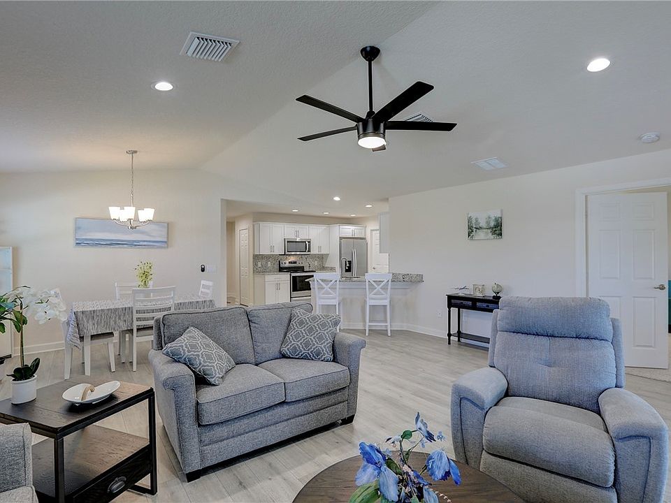 Easy Life. Lasting Style. Nearly new concrete block home in a 55+ community where lawn care, golf & endless activities make life feel effortless. Shows like a model with timeless white cabinetry, updated hardware & faucets, upgraded stainless steel appliances & tile and wood-look flooring in main living areas. Enjoy meals at the breakfast bar w/granite counters, in the dining room or on the covered porches. New fans, lighting, blinds, glass shower doors, metal roof & impact windows/doors. Heated pools, tennis, pickleball & great neighbors—the total package! Room size/sqft subject to error