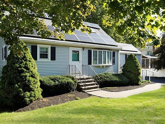 Lovingly maintained classic New England Cape in desirable Milford neighborhood. What began as a standard cape has been expanded and improved over the years. Upstairs there are 2 front to back bedrooms and a full bathroom with radiant heat floors. First floor features kitchen with granite counters, formal dining room, 2 bedrooms and full bath. Spacious living room leads to bright and airy sunroom with access to deck overlooking lovely fenced in back yard. Pride of ownership shows in the many updates - hardwood floors, ceiling fans, solar panels, central A/C, gas grill hook up, full tiled bathrooms, french doors, vinyl siding and Rinnai tankless water heater. The storage room under the deck offers generous storage for everything from garden tools to bikes and camping gear. This home has it all, including bonus room with cedar closet and large storage area above the 2 car garage. Convenient to schools, shopping, hospital and major routes.