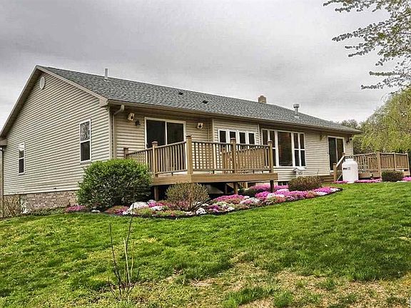 Beautiful 3 bdrm, 2.5 bath ranch offers picturesque setting w the privacy you deserve! Peaceful, 3.88 acres wooded lot w/over an acre of living space. Lg eat in kitchen w/Corian counter, custom cabinets and cook top that down vents to outside. Hand finished wood trim through out, red oak floors, and 2/6 construction for deep window sills. Propane fire place in lvg/fam rm. Decks off dinette and master bdrm. Active radon sys, back up generator and so much more! . See addendum for more details of home!!