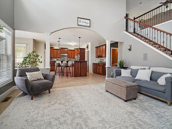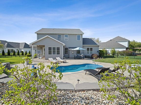 Custom built 1.5 story home with beautiful in-ground pool that backs up to #9 fairway at The Den Golf Course. Very open plan with large island & 2 story great room. First floor primary bedroom with 9 ft ceilings & large walk-in closet. Second floor has loft & 2 more spacious bedrooms with walk in closets. Finished lower level with another bedroom, full bath, huge family/game room with full wet bar that has granite counters, full size fridge & dishwasher. Bonus room in basement used as exercise room. Surround sound on both levels for entertainment & whole house audio for entertaining. Heated garage. Enjoy the privacy in the pool thanks to a sunken pie shaped lot. Located at the end of a cul-de-sac away from traffic.