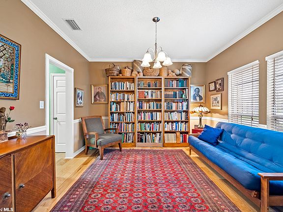 Well maintained home on CORNER LOT nearly 1/2 acre fenced, on a wonderful street in Popular Spanish Fort Estates. This home has beautiful hickory wood floors downstairs, with formal dining room (makes great OFFICE), half bath, large great room with breakfast/morning room, vaulted ceilings, opens to wonderful climate controlled 12x22 SUNROOM. Updated Kitchen with tile backsplash, granite counter tops and stainless appliances. OVERSIZED LAUNDRY room serves as pantry overflow and potential craft space. The backyard is a GARDENER'S DREAM with multiple FRUIT bearing TREES to include: lemon, satsuma, fig, 2 pear trees, scuppernongs, muscadines, 6 blueberry trees and space to plant herbs and vegetables! There is a STORAGE ROOM under the house with usable work shop type space. BRAND NEW WATER HEATER. Mini Split in Sunroom is new in 2022.