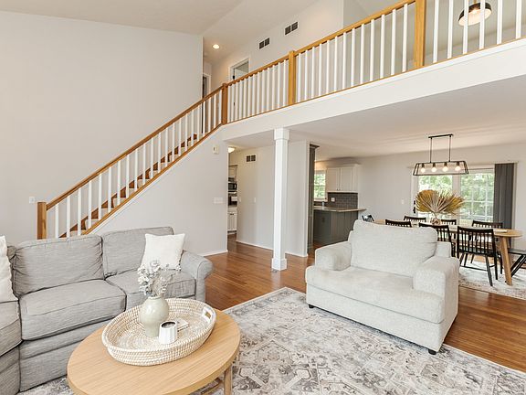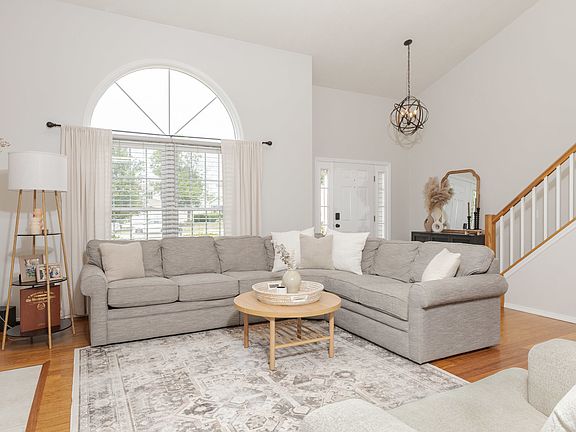 Stunning property with fresh paint, new blinds in dining and great room! You will fall in love the moment you step in with newer bamboo flooring! So much natural light in the 2story great room with a cathedral ceiling and gas fireplace. Gorgeous, updated kitchen with granite countertops, and glass backsplash! Pantry space! Updated main floor bath and bedroom. Laundry is on the main floor too! HVAC and water heater replaced in 2022! Roof is about 5 years old! New black wrought iron fence in 2023 on this oversized pie shape lot, approx. .25 acre in town! Professionally landscaped and the front sidewalk has been slab jacked. Upstairs has 2 bedrooms and a loft that could easily be converted into a 4th bedroom or office. Unfinished basement with egress window, rough in for future bath and steel beam to have an open family room. Ready to make it your own!! Pride of ownership!!!