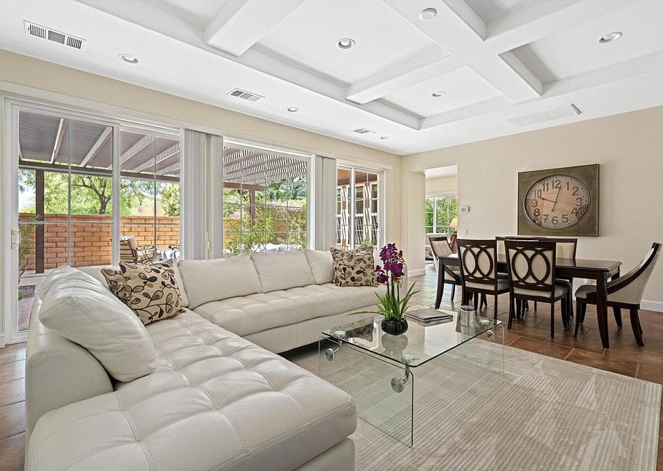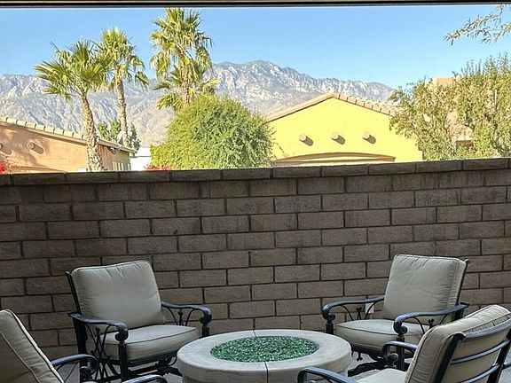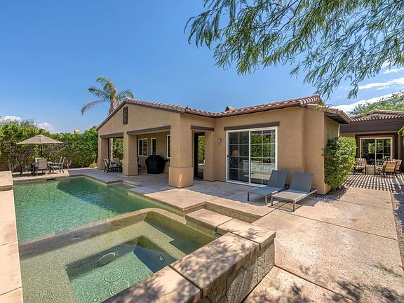 Discover this exquisite Santo Tomas home on a corner lot in a peaceful cul-de-sac. Enjoy total privacy with lush landscaping around your saltwater pool and spa, complete with elegant water features--perfect for desert days and nights. Inside, soaring ceilings and a smart layout offer great bedroom separation. The living and dining rooms feature a cozy fireplace, and the family room connects seamlessly to the kitchen. The home centers around an inviting courtyard with a fire feature and a spacious patio cover for entertaining. Freshly painted interiors, a recently painted exterior, and new front landscaping add to the home's charm. The kitchen boasts sleek black appliances and granite countertops, while the primary suite offers a walk-in shower, soaking tub, and dual vanities. 38 leased Solar panels enhance energy efficiency. Santo Tomas is a highly sought-after community with a serene lake, perfect for sunset cruises. The low HOA fee includes social and tennis memberships to the Mission Hills Country Club and include pickle ball, fitness/gym, and dining, which makes for an incredible value! Sold furnished per inventory list, this home is move-in ready! 38 Solar Panels. Lease is $294.73 per month.