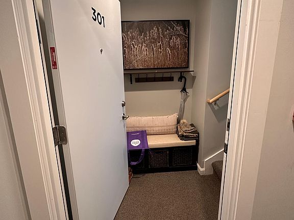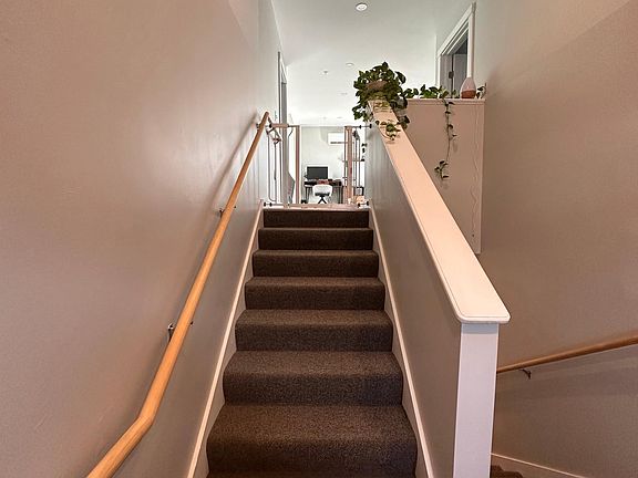 Available 8/1. Beautiful, updated, modern rental with vaulted ceilings and lots of natural light. Kitchen is complete with granite countertops, stainless steel appliances (including dishwasher), island with seating, and under cabinet lighting. The large bathroom has a tile shower, stacked washer/dryer in unit, vanity with granite top, and radiant heated floors. The living room has sliding glass doors, out to a private deck that overlooks green space and woods. The landing in the stairwell makes great extra office space or mudroom. Mini splits for heat and AC. Pets considered. One year lease.
