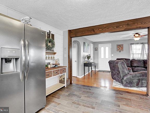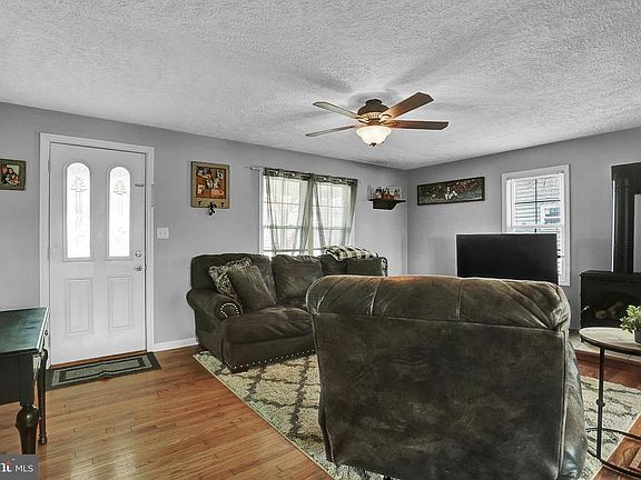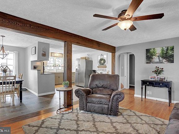 Well maintained brick cape cod loaded with charm. 1st floor master bedroom with adjoining den that could also be an additional walk-in closet. Open living/kitchen/dining room floor plan, propane fireplace in the living room, remodeled kitchen with beautiful laminate floors, all appliances convey, wood floors and new carpeting. Fresh, trendy color scheme. 4 bedrooms, 2 full baths, large covered front porch, rear deck, fenced yard. detached 2 car garage with overhead storage loft. Replacement windows, heat pump, public sewer, well water.