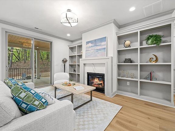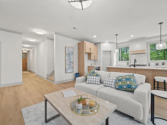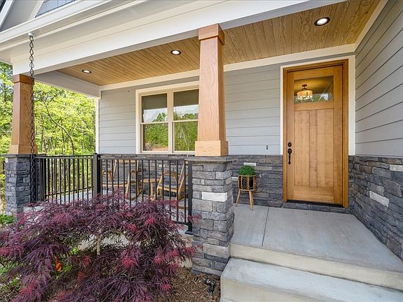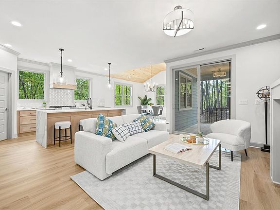 At the heart of the home is a chef’s kitchen, featuring beautiful quartz countertops, a spacious island, a dual-fuel range with a custom vent hood, and a built-in microwave. The open-concept layout seamlessly connects the kitchen to the dining area with vaulted tongue-and-groove wood ceilings, and the inviting living space equipped with a cozy fireplace — perfect for creating cherished moments with family and friends. On the main level you'll also find the primary suite, which includes a spa-like bathroom with a frameless glass walk-in shower, floor-to-ceiling tile, a double vanity, and a spacious closet. Furthermore, the main level offers two additional well-appointed bedrooms, a second full bath, a half bath and laundry room that includes a utility sink. As you ascend to the upper floor, you'll discover a generous flex room, ideal for a home office or recreational space, which leads to a third full bathroom and a spacious fourth bedroom. Step outside to the meticulously designed and landscaped backyard, featuring a large, covered porch and fire pit, creating an inviting atmosphere for relaxation and outdoor gatherings. This home emphasizes energy efficiency throughout, including energy-efficient roof sheathing that enhances insulation and reduces energy costs, low-emissivity (Low-E) windows that reflect heat while allowing ample natural light, a state-of-the-art HVAC system equipped with a fresh air vent and tankless water heater. Additionally, the crawl space is fully encapsulated and equipped with a dehumidifier, ensuring a healthy indoor environment and protection against moisture. Attention to detail extends to all areas of the home, including high-quality epoxy flooring in the garage, providing a sleek and low-maintenance finish. Enhanced with oversized six-inch gutters, this property ensures superior water management and minimizes overflow risks.