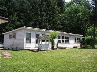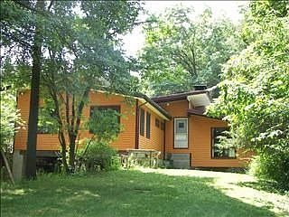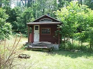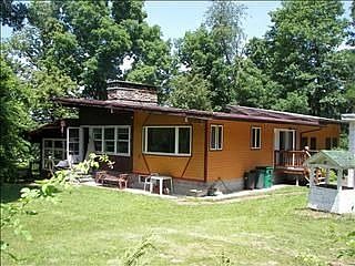 Very unique property, consists of main house with one bedroom with oversized living room and den and full basement with workshop area. House is large size almost 1300 sf. Franklin Lloyd Wright inspired house. There is also a secondary cottage or large outbuilding that has a kitchen, bath and 100 amp electric service. Three shed/playhouses on 3+ acres. House has serious issues and most likely cash purchase ony.