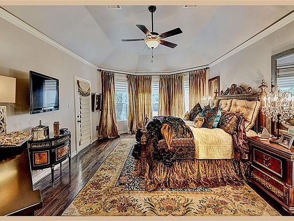 Stunning 5-bedroom, 3.5-bath home situated on the 7th tee of the Palmer Course with serene greenbelt views. Features include wood floors throughout, custom finishes, and elegant trim work. Open kitchen flows into the family room with stainless steel appliances, granite countertops, under-cabinet lighting, and a custom range hood. Family and formal living areas share a striking stone fireplace. Private study with French doors and built-ins. Upstairs game room opens to a balcony; the primary suite offers golf course views, a spa-like bath, and custom walk-in closet. Outdoor living shines with a covered patio, heated pool and spa, three-car garage, and beautifully landscaped corner lot.