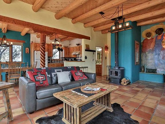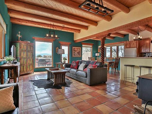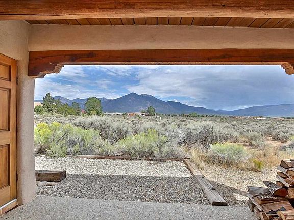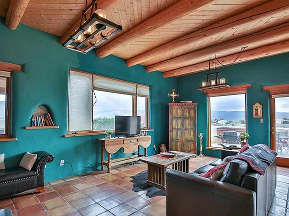 YOUR PLACE IN THE FUN! Whether you're looking for a stylish get-a-way or manageable home sweet home, this 1,200 +/- sq. ft. 2BR/1BA adobe could fit the bill. The location is ideal with easy access off of Blueberry Hill to get you to the slopes to ski, out to the rivers to fish, off to USFS or the Nat'l Monument to hike, bike, or climb, S. to TCC to golf, or be off to the heart of Taos to shop, gallery hop or stroll the Farmer's Market. With lots of windows, the bold view of Taos Mountain will start your day with a smile as you delight in the everchanging skies and high desert beauty. The living areas are open yet defined with Southwest flair like vigas, nichos, Saltillo tile floors, and Mexican tile accents. A large colorful mural reminiscent of Diego Rivera graces one wall with colors mimicking the natural landscape and views. The patio off the dining room adds space to entertain or the perfect spot to relax and bask in the sun or the beauty of nature. At days end, unwind in the hot tub and pick out your favorite constellation in the clear dark skies. Subfloor radiant heat (nat'l gas) plus a woodstove will keep you toasty in the winter and the thick adobe walls will cool in the Summer. Life if short. Live Big!