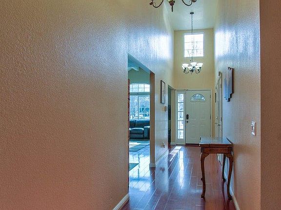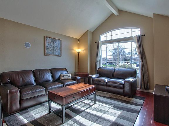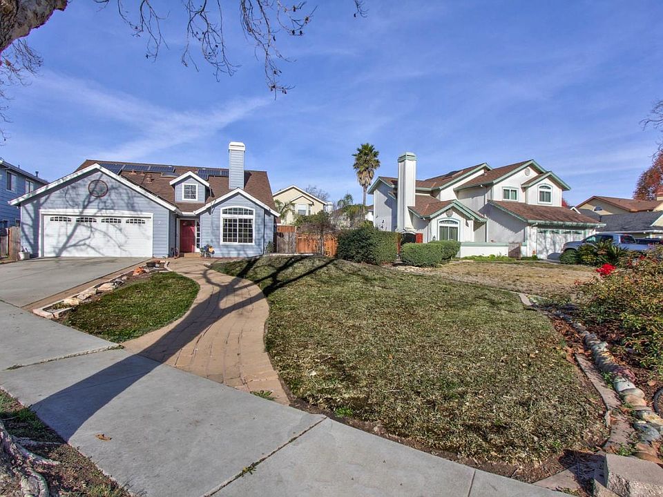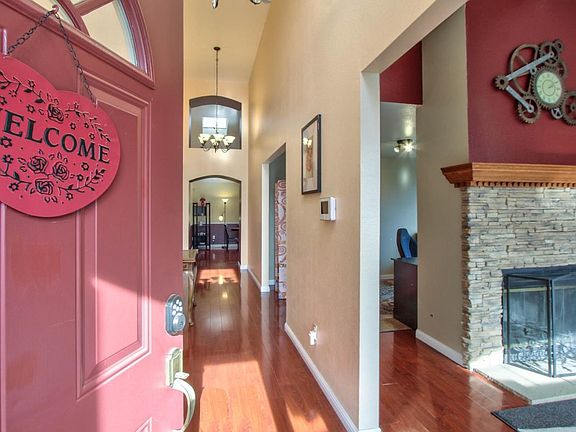 Lovely three bedrooms, two bathrooms in a highly desirable Creekbridge neighborhood. The open floor plan features high ceilings, beautiful laminate flooring, custom paint, and skylights that offer much natural light. Two chandeliers add elegance to the long foyer entry. Custom wood fireplace and mantel are the highlights of the living room.The kitchen includes all stainless steel appliances, beautiful counter tops and tiled floor. The large backyard has raised planter boxes, stamped cement, and offers many outdoor possibilities. This single level home is located in a quiet cul-de-sac. Home is also set up with Energy Saving Solar Panels. It's got the Wow Factor!