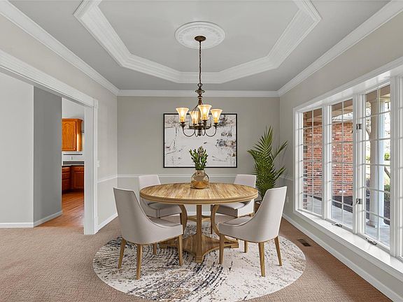 LUXURY BRICK RANCH in quiet cul de sac on 1.2 ACRES, backing to woods for ultimate privacy. INCREDIBLE CURB APPEAL with covered porch, dormers, brick walkways, lush landscaping, 3-CAR side entry garage, and NEW ROOF. Foyer opens to elegant dining room with tray ceiling, bow window & crown detail. SOARING VAULTED living room with brick gas fireplace to-ceiling & WALL OF WINDOWS showcasing views. HARDWOOD FLOORS span entry, kitchen, breakfast, primary suite & office. Vaulted kitchen with custom 42" wood cabinets, solid-surface counters, SS APPLIANCES & pantry. Breakfast room access to heated SUNROOM & paver patio. Relaxing primary suite with tray ceiling, WALK-IN CLOSET, jetted tub, separate shower, access to COVERED DECK. Adjacent office with French doors. Hall beds share bath with tub/shower combo. Downstairs rec room with gas fireplace, bonus room, 2 beds, bath, plus storage. French doors WALKOUT to 2nd PAVER PATIO. Near Katy Trail, historic district, Hwys 364/94 & TOP-RATED SCHOOLS. Additional Rooms: Sun Room